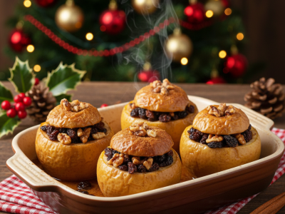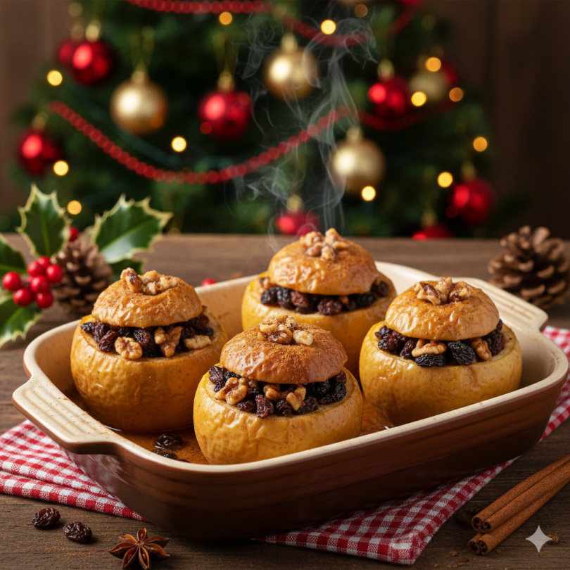 Необходими продукти: 4 средно големи ябълки, 4 с. л. стафиди, 4 с. л. едро нарязани орехи, 2 с. л. кафява захар (или кленов сироп), 1 ч. л. канела, 40 г маргарин или кокосово масло (по 10 г за всяка ябълка), около 100 мл вода или ябълков сок (за тавата)