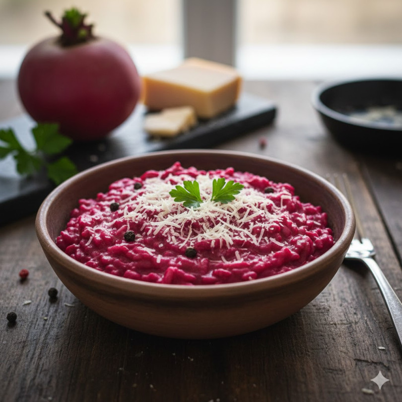 Начин на приготвяне: Лукът се нарязва на ситно и се задушава в мазнината до прозрачност. Добавя се оризът и се разбърква за кратко, докато стане стъклен. Цвеклото се пасира и се прибавя към ориза. Постепенно се налива горещият бульон, като се разбърква често. Готви се около 18-20 минути, докато оризът стане кремообразен и леко ал денте. Накрая се добавя пармезанът и се подправя със сол и черен пипер. Ризотото е с наситен цвят, мек вкус и изключително хранително.
