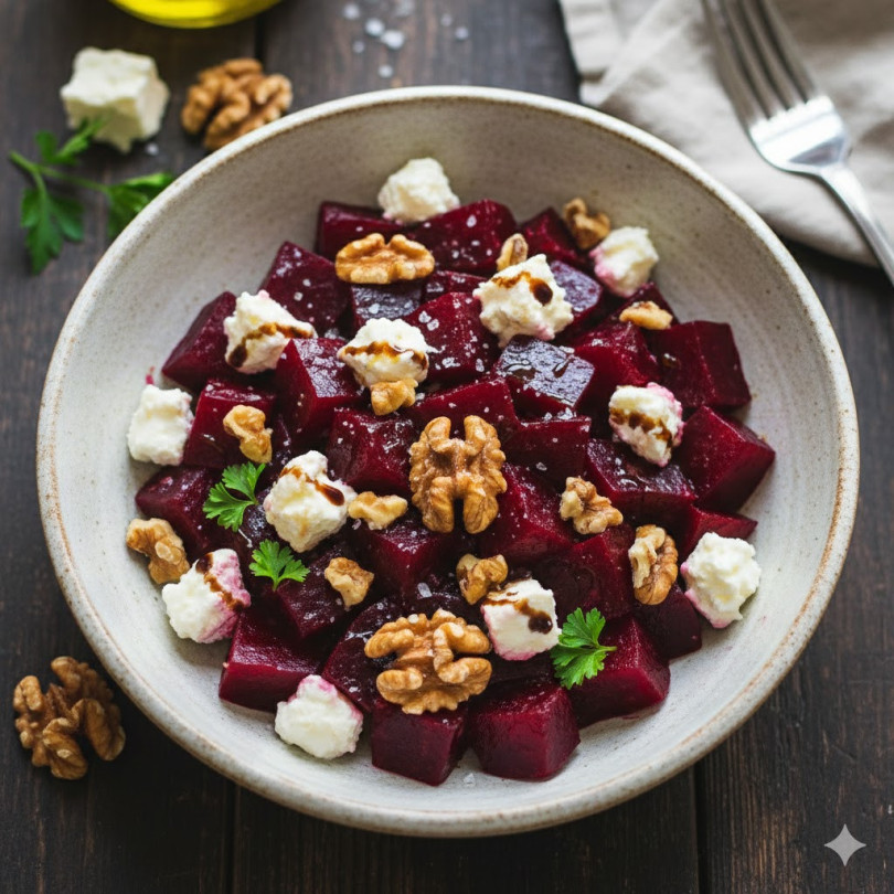 Начин на приготвяне: Цвеклото се измива добре, увива се във фолио и се пече на 180 градуса около 50-60 минути, докато омекне. След като изстине, се обелва и нарязва на кубчета. Орехите се запичат леко на сух тиган и се натрошават. Всички продукти се смесват в купа, добавят се зехтинът, оцетът и солта. Салатата е балансирана, засищаща и много подходяща както за обяд, така и за вечеря.