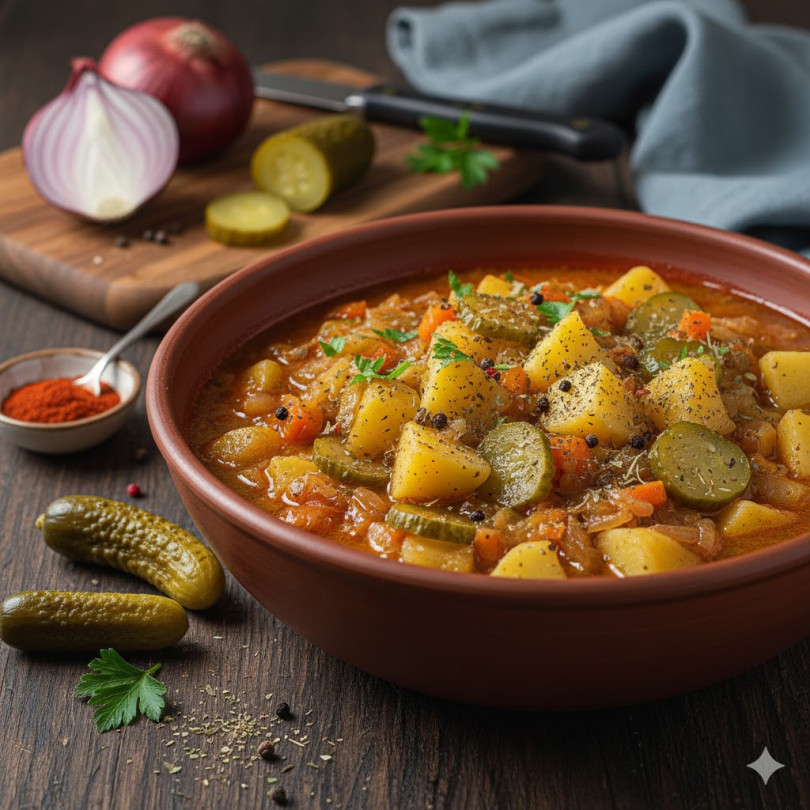Начин на приготвяне: Лукът и морковът се нарязват на ситно и се задушават в олиото. Добавя се червеният пипер, след което се слагат нарязаните на кубчета картофи. Налива се водата или бульонът и ястието се оставя да ври, докато картофите омекнат. Киселите краставички се нарязват на дребно и се добавят в края заедно с подправките. Оставя се да поври още 5-7 минути. Краставичките придават свежа киселинност и правят яхнията изненадващо балансирана и апетитна.