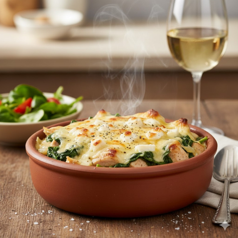 Начин на приготвяне: Пилешкото месо се нарязва на хапки и се запържва леко в олиото до златисто. Добавят се ситно нарязаният лук и чесънът и се готвят до омекване. Слага се спанакът и се оставя да се задуши, докато намали обема си. Сместа се разпределя в гювечетата, отгоре се нарежда нарязаното топено сирене и се залива със сметаната. Подправя се със сол, черен пипер и щипка индийско орехче. Пече се в предварително загрята фурна на 180°С около 20-25 минути.