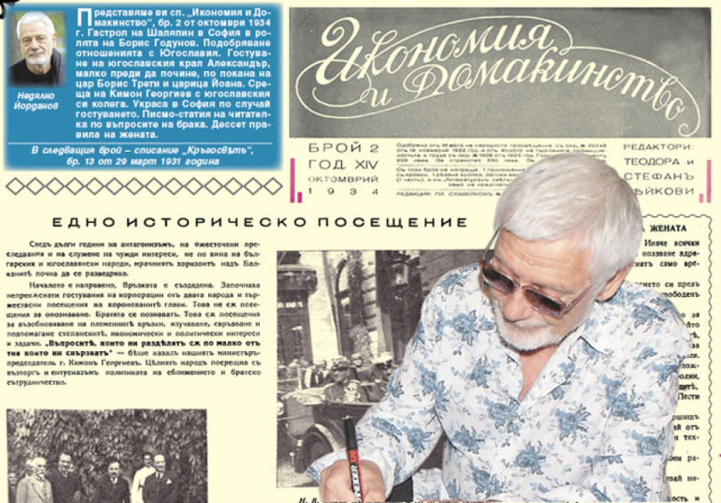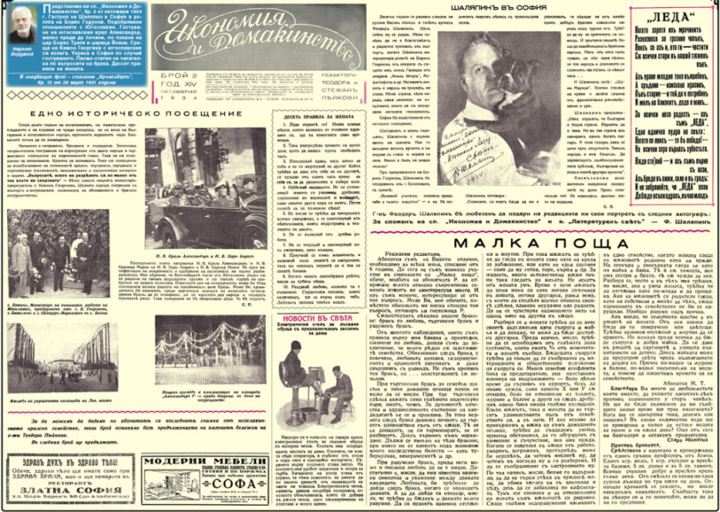Представяме ви сп. “Икономия и Домакинство”, бр. 2 от октомври 1934 г. Гастрол на Шаляпин в София в ролята на Борис Годунов. Подобряване отношенията с Югославия. Гостуване на югославския крал Александър, малко преди да почине, по покана на цар Борис Трети и царица Йоана. Среща на Кимон Георгиев с югославския си колега. Украса в София по случай гостуването. Писмо-статия на читателка по въпросите на брака. Дессет правила на жената.