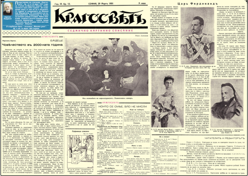 Представяме ви списание “Крaгосвeтъ”, бр. 13 от 29 март 1931 година. Статия на Марслен Бертло “Човечеството през 2000 година”. За съжаление нищо от нея не се е сбъднало. 70 години от рождението на бившия Цар Фердинанд. Из изложбата на карикатуристите. Карикатура от Коцев за калните улици в София. Райко Алексиев поднася своята поредна политическа карикатура – години преди да почне сам да издава своя вестник “Щурецъ”. Вицове.