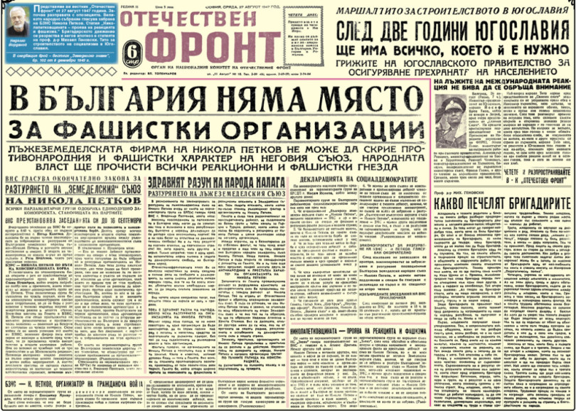 Представяме ви вестник “Отечествен фронт” от 27 август 1947 година. Започва разправата с опозицията. Великото народно събрание гласува забрана на БЗНС Никола Петков. Статия “Николапетковщината – проява на реакцията и фашизма.” Бригадирското движение се разраства и негов апотеоз е статията на проф. д-р Михаил Геновски. Тито за строителството на социализма в Югославия.
