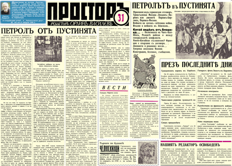 Представяме ви вестник “Просторъ”, бр. 31 с редактор Орлин Василев. Главният редактор Орлин Василев след тримесечен арест и процес е оправдан. Голяма статия “Петролът в пустинята”. Събития в света в навечерието на втората световна война в Манджурия, СССР, Чехословакия, Франция, Китай, Англия. Последни новини. Наука за малцинствата. Карикатура.