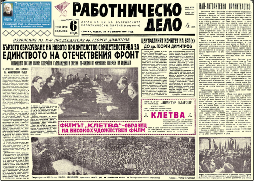 Представяме ви вестник “Работническо дело”, бр. 274 от 24 ноември 1946 година. Това е първия брой на вестника, който отразява заседанието на новото правителство на Отечествения фронт, начело с Георги Димитров. Правителството е избрано от Великото народно събрание и опозицията в него е малцинство. Поздравления за Георги Димитров. Реч на Вълко Червенков на столичния митинг.