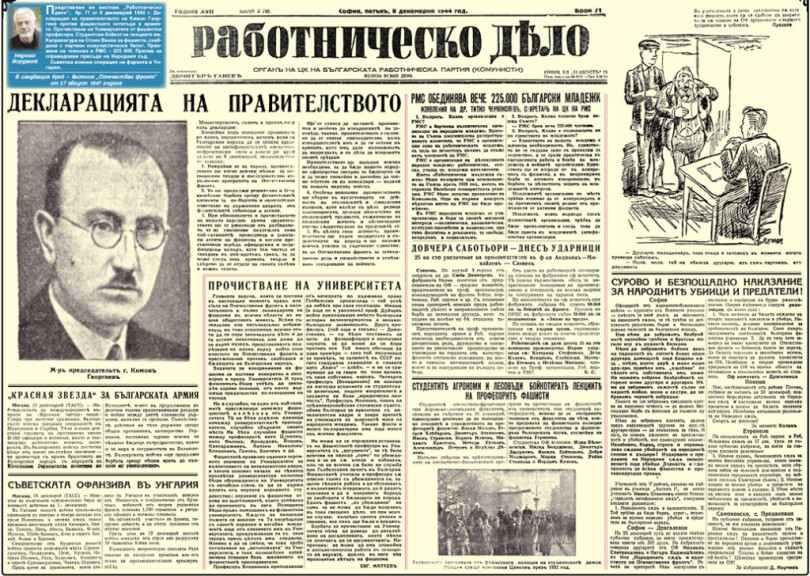 Представяме ви вестник “Работническо дело”, бр. 71 от 8 декемврий 1944 г. Декларация на правителството на Кимон Георгиев против фашистките остатъци в армията. Прочистване на Университета от фашистки професори. Студентски бойкот на лекциите им. Каприкатура на Стоян Венев за фашисти, снабдени с партиен комунистически билет. Приемане на членове в РМС – 225 000. Призив за справедливи присъди на Народния съд.