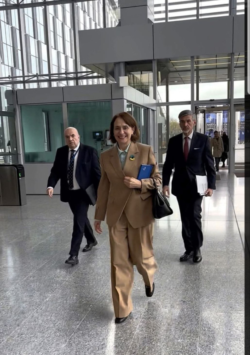 Тоалетът ѝ бе в модния цвят камел, със структурирано сако, подчертани рамене и широк прав панталон с висока талия. Кройката на костюма ѝ е типично делова – изчистена, без излишни детайли, но с безупречна изработка. Това е стил, характерен за най-високия клас модни къщи и предпочитан от жени на високи публични позиции.