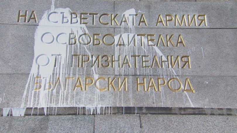 Бяла боя е плисната точно върху надписите на фасадата на монумента, а долу е излято автомобилно масло.