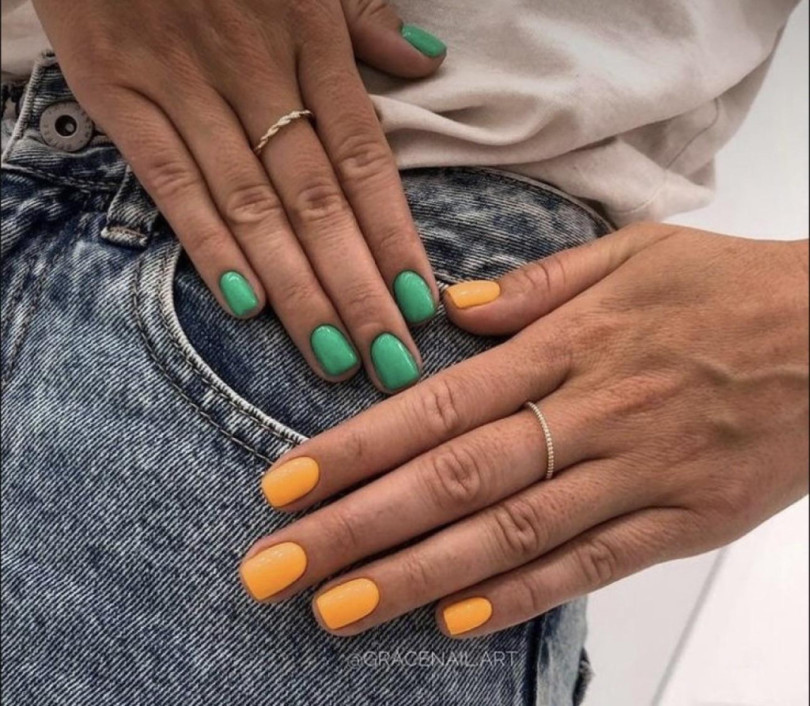 Не можете да изберете своя цвят? Тогава си направете маникюр с два цвята наведнъж: единия на едната ръка, а другия на другата. Този вариант изглежда интересно дори без допълнителен дизайн.