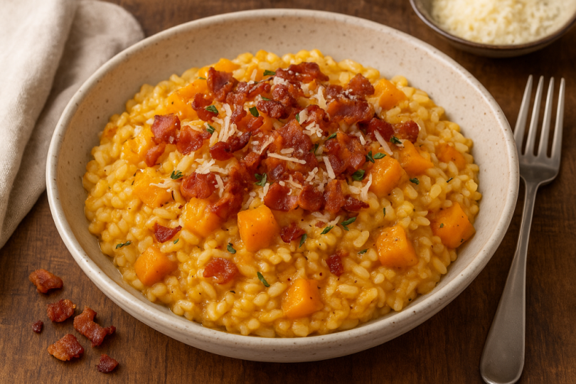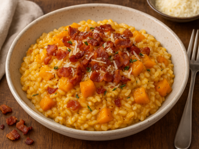 Начин на приготвяне: В голяма тенджера загрейте малко маслиново олио и запържете ситно нарязания лук и чесън до прозрачност. Добавете ориза арборио и разбъркайте добре, докато зърната станат леко стъклени. Деглазирайте с чаша бяло вино и оставете да се изпари алкохолът. Постепенно започнете да добавяте топлия зеленчуков бульон, черпак по черпак, като разбърквате непрекъснато, за да пусне оризът своята кремообразна структура. Междувременно запечете кубчетата тиква във фурна с малко зехтин, сол и мащерка, докато станат златисти и карамелизирани. В края на варенето добавете тиквата към ориза и разбъркайте внимателно, след което сложете бучка масло и щедро количество настърган пармезан. За финал запържете бекона до хрупкавост, натрошете го и го поръсете върху готовото ризото. Ястието се поднася топло, с допълнителен пармезан и свежа мащерка.