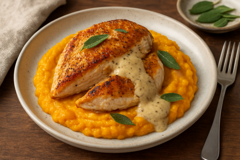 Начин на приготвяне: Нарежете тиквата на парчета и изпечете във фурна с малко зехтин и чесън, докато омекне и стане златиста. След това я пасирайте с масло и готварска сметана, докато се получи кадифено пюре. Овкусете със сол и пипер. Пилешките гърди подправете със сол, пипер и малко лимонов сок, след което ги запечете на тиган или грил до златиста коричка, а после довършете във фурна, за да останат сочни отвътре. За соса разтопете малко масло в тиган, добавете листа градински чай и ги запържете леко, след което деглазирайте с бяло вино и пилешки бульон. Оставете сосът да се редуцира, докато се сгъсти и придобие интензивен аромат. Върху чиния оформете основа от тиквеното пюре, подредете резени от пилешкото филе и полейте със соса. Ястието е елегантно, с балансиран вкус между сладостта на тиквата и свежия, леко пикантен аромат на градинския чай.