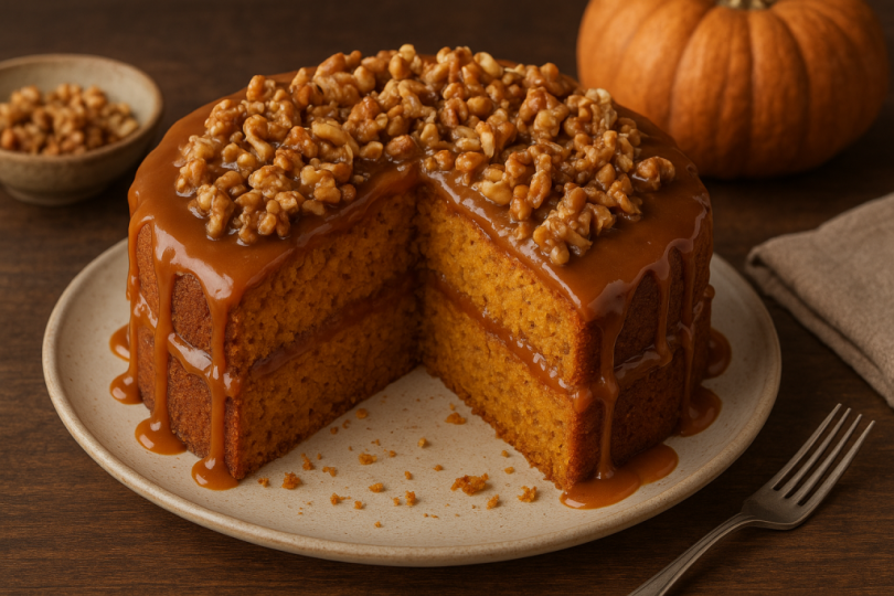 Начин на приготвяне: Разбийте яйцата със захарта до пухкав крем, след което добавете олиото и настърганата тиква. В отделна купа смесете брашното с бакпулвера, канелата и индийското орехче, после внимателно обединете сухите съставки с мокрите. Изсипете сместа в кръгла форма и печете до готовност. След като блатовете изстинат, ги разрежете хоризонтално. За крема разбийте маскарпонето с пудра захар и ванилия, след което добавете разбита сметана за пухкавост. Върху всеки блат нанесете тънък слой карамелен сос, поръсете със смлени орехи и покрийте с крем. Сглобете тортата и завършете с обилно количество крем отгоре, украсено с карамелена струя и цели орехови ядки. Тази торта е сложна и многопластова, с комбинация от аромати, които носят усещането за есен – сладостта на тиквата, богатството на карамела и хрупкавостта на орехите.