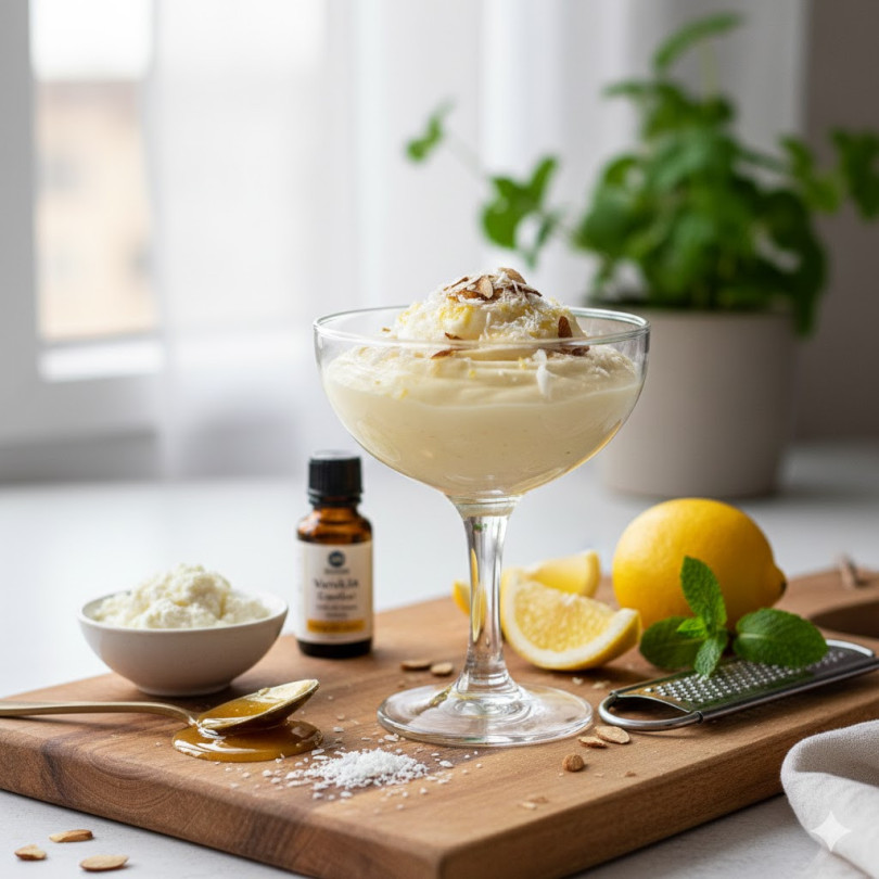 Начин на приготвяне: Изварата се пасира заедно с киселото мляко до напълно гладка и кремообразна текстура. Добавят се медът, лимоновата кора, сокът и ванилията. Всичко се разбърква добре, докато се получи лек, ароматен крем. Оставя се в хладилник за поне 30 минути, за да се стегне и да се смесят вкусовете. Поднася се охладен, поръсен с настъргани бадеми или кокос, които добавят фин завършек и лек хрупкав контраст.