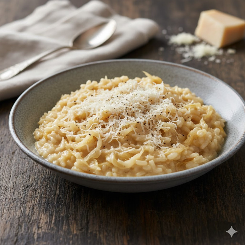 Начин на приготвяне: Лукът и чесънът се нарязват на ситно и се задушават в зехтина до прозрачност. Добавя се оризът и се разбърква, докато стане леко стъклен. Налива се бялото вино и се оставя да се изпари. Постепенно се добавя топъл бульон, като се разбърква непрекъснато. След около 10 минути се прибавя ситно нарязаното кисело зеле. Готвенето продължава, докато оризът стане кремообразен, но с леко твърда сърцевина. Накрая се добавят маслото и пармезанът, разбърква се до кадифена текстура и се подправя с черен пипер. Получава се балансирано ястие, в което киселинността на зелето контрастира приятно с богатия вкус на сиренето.