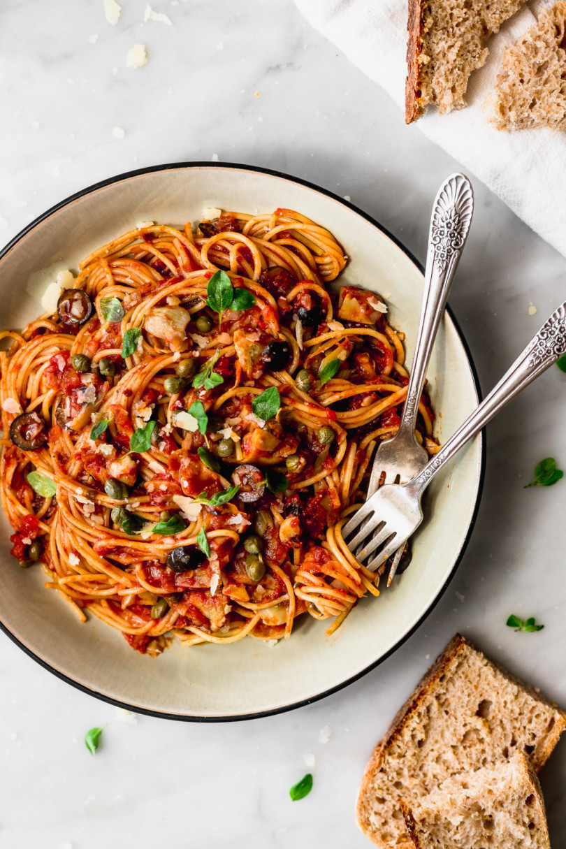 Необходими продукти: 250 г паста (спагети, пене, фузили), 4-5 с. л. лютеница, 2 с. л. маслиново масло, 1 скилидка чесън, 6-7 сушени домата (накиснати в зехтин), шепа черни маслини без костилки, сол, черен пипер, босилек, настърган пармезан (или български кашкавал)