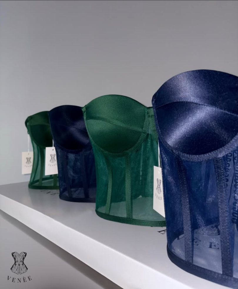 На практика обаче брюнетката е заложила на едно – корсетите. Венцислава вече има онлайн бутик, макар и без сайт, без физически магазин и без обявени цени. Брандът носи името VENEE и се развива изцяло в социалните мрежи. До неотдавна в колекцията присъстваха само два модела – черни, силно вталени корсети с гръмките имена „Париж“ и „Казабланка“, изработени, по нейни думи, от висококачествени материали с фина дубайска дантела. И двата модела се предлагаха само в размери 36, 38 и 40 – тоест за фини и слабички дами.