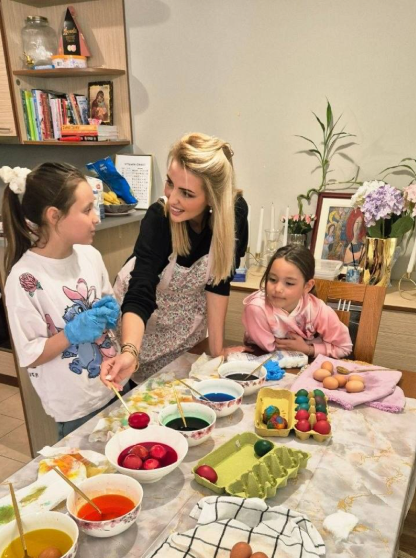 Бившата синоптичка от БНТ Ева Кикерезова организира истинска работилница за боядисване на яйца за дъщерите си Екатерина и Елена, докато синът ѝ Николай не се включил в подготовката.