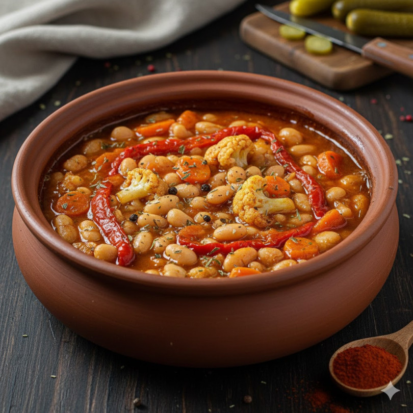 Начин на приготвяне: Лукът се нарязва и се запържва леко в олиото. Добавя се червеният пипер и веднага след това – туршията, нарязана на по-едри парчета. Сместа се прехвърля в гювеч или огнеупорен съд, прибавя се бобът, подправките и водата. Ястието се пече на 180 градуса около 40 минути, докато се сгъсти и ароматите се слеят. Получава се питателно, но леко ястие, богато на фибри и полезни бактерии.