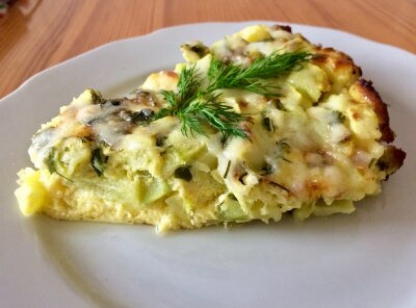 ПРОДУКТИ: 5-6 картофа, 2 тиквички, 200 г бяло сирене, 4 яйца, 150 г кашкавал, зехтин, сол, босилек или ронена чубрица.