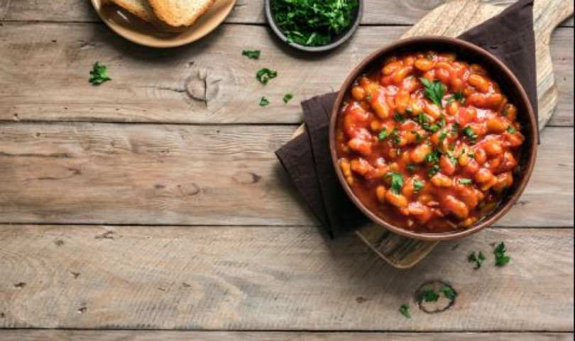 ПРИГОТОВЛЕНИЕ: Бобът се накисва за една нощ. След това се сварява, като първата вода се изхвърля. Свареният боб се отцежда, а 200 мл от водата от варенето се запазват. Лукът, целината и чушката се почистват и се нарязват на малки кубчета. Запържват се за кратко в сгорещеното олио. Добавя се доматеният концентрат. Сипва се бобът и се поръсва с наситнен магданоз и червения пипер. Овкусява се със сол, черен пипер и риган. Прехвърля се в керамичен съд, налива се заделената вода и се пече в загрята на 180 градуса фурна с вентилатор до златисто – около 40 минути.