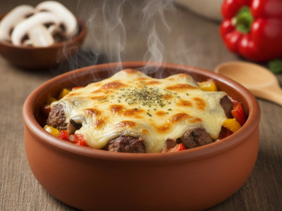 Необходими продукти: 300 г кайма, 1 яйце, 1 филия хляб, 200 г гъби, 1 червена чушка, 1 домат, 100 г настърган кашкавал, 2 с. л. олио, сол, черен пипер, чубрица.