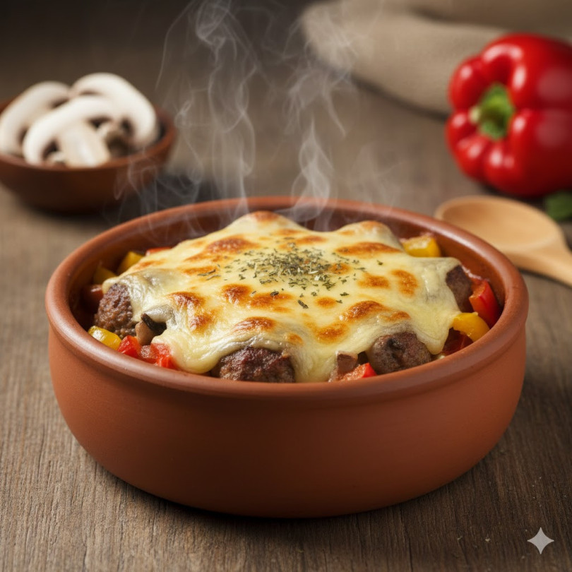 Начин на приготвяне: Каймата се омесва с яйцето и накиснатата и изцедена филия хляб. Подправя се със сол и черен пипер и се оформят малки кюфтенца. Те се запържват леко в тиган. Гъбите се нарязват и също се запържват до омекване. Във всяко гювече се поставят кюфтенца, гъби, нарязана чушка и домат. Поръсва се с чубрица и се пече на 180°С около 25 минути. Накрая се добавя настърганият кашкавал и се връща във фурната за още 5 минути, докато се разтопи и зачерви.