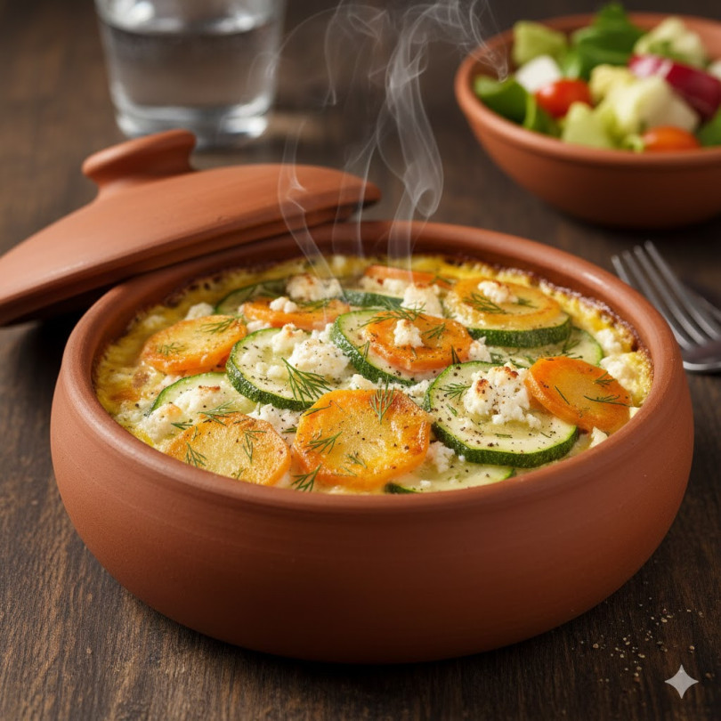 Начин на приготвяне: Картофите се нарязват на тънки филии и се бланшират за 5 минути във вряща вода. Тиквичката и морковът се нарязват на колелца. В гювечетата се подреждат пласт картофи, тиквички и моркови, като всеки слой се посолява леко. Отгоре се натрошава сиренето. Яйцата се разбиват с млякото и малко черен пипер, след което сместа се излива равномерно във всяко гювече. Пече се на 180°С около 30 минути до златисто. Преди поднасяне се поръсва със ситно нарязан копър.