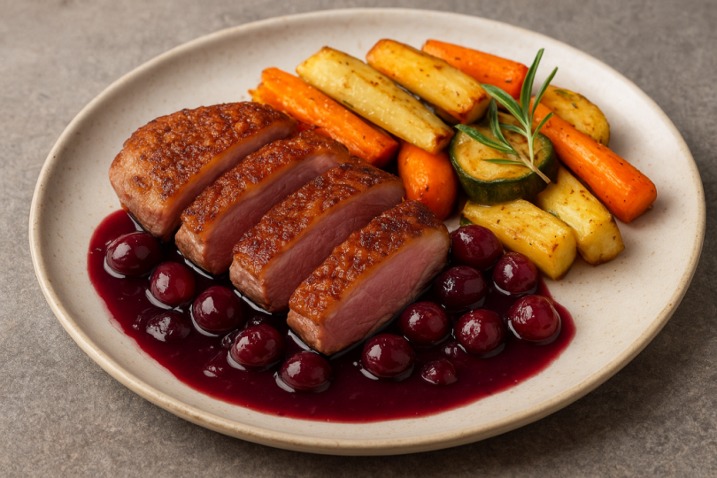 Начин на приготвяне: Патешките гърди се подготвят, като кожата се нарязва на ромбчета, без да се стига до месото. Те се поставят в сух тиган с кожата надолу и се запичат на умерен огън, докато мазнината се стопи и кожата стане златиста и хрупкава. След това се обръщат за кратко от другата страна и се прехвърлят в загрята фурна, за да се доизпекат според желаната степен на сочност. Междувременно се приготвя гроздовият сос, като в малка касерола се загрява масло, добавя се шепа разполовено грозде и се оставя леко да се карамелизира. Налива се червено вино и се прибавя лъжица мед, а сосът се оставя да къкри, докато се редуцира и сгъсти до кадифена консистенция. Зеленчуците се нарязват на едри парчета, овкусяват се със зехтин, сол, пипер и розмарин и се изпичат във фурна, докато придобият карамелизиран вкус. Ястието се поднася, като патешкото месо се нарязва на тънки филии, подрежда се върху чиния до порция печени зеленчуци, а отгоре се залива с ароматния гроздов сос, който придава неповторим контраст между сладост и соленост.