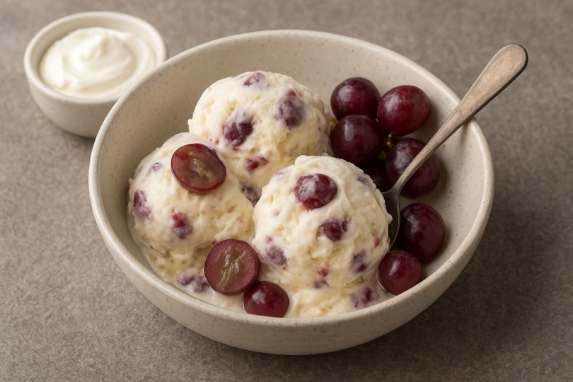 Начин на приготвяне: Гроздето се почиства и се поставя в тенджера с малко захар и лимонов сок, след което се оставя да ври на слаб огън, докато зърната омекнат и пуснат сок. Получената смес се пасира и се прецежда, за да се отстранят люспите и да остане гладко пюре. В отделна купа се разбива крем сиренето с пудра захар до пухкава текстура, добавя се охладеното гроздово пюре и постепенно се смесва с разбитата на гъст крем течна сметана. Всичко това се изсипва във форма и се поставя във фризер, като през първите няколко часа се разбърква периодично, за да се избегне образуването на ледени кристали. За да стане десертът още по-впечатляващ, към него може да се добави основа от натрошени бисквити, смесени с малко разтопено масло, която се подлага на дъното на формата, преди да се изсипе сладоледът. Така при поднасяне се получава контраст между хрупкава основа, кадифен сладолед и богат вкус на грозде. Десертът е не само освежаващ, но и носи усещане за изисканост, което рядко се среща в домашно приготвените сладоледи.