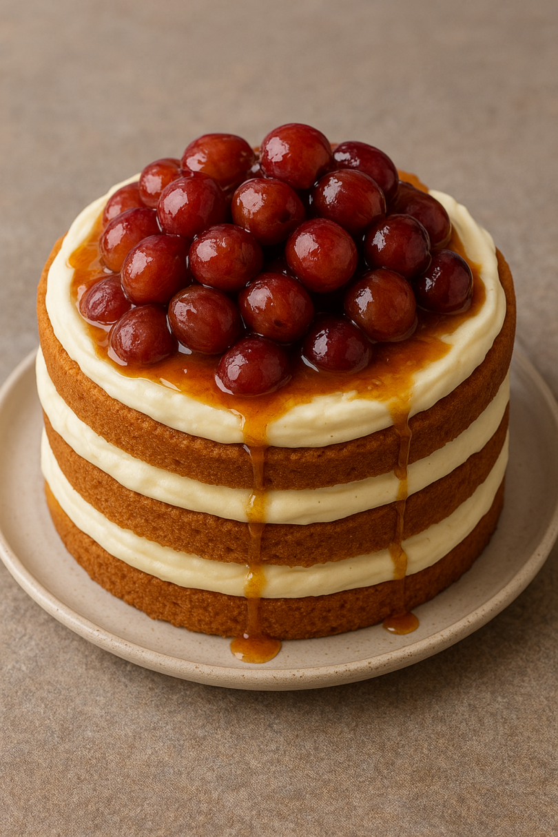 Начин на приготвяне: За основата се подреждат бишкоти в тортена форма и се напръскват леко с топло мляко, за да омекнат и да създадат стабилен пласт. Междувременно се приготвя ваниловият крем, като в тенджера се загрява мляко със захар и ванилия, а в отделен съд се разбиват жълтъци с нишесте и малко мляко. Горещото мляко се налива внимателно към жълтъчната смес при непрекъснато бъркане и след това всичко се връща на котлона, докато се сгъсти. Когато кремът стане гъст и гладък, се прибавя бучка масло за кадифена текстура и се оставя да се охлади. Върху бишкотите се разстила първи слой крем, отгоре се добавя ред от измито и разполовено грозде, след което следва нов пласт бишкоти и отново крем. За да се завърши тортата, в тиган се карамелизира кафява захар с няколко капки лимонов сок и в получената карамелена смес се добавя шепа гроздови зърна, които се овалват внимателно и подреждат върху тортата като украса. Отстрани се поръсва с леко запечени филирани бадеми. Тортата се оставя за няколко часа в хладилник, за да стегне, а при поднасяне впечатлява с богат вкус и деликатна комбинация от сладост, свежест и карамелена нотка.