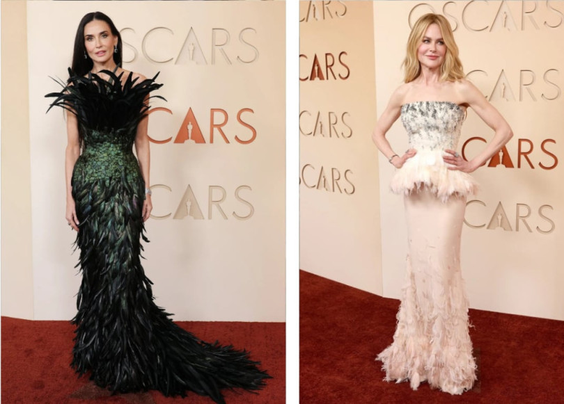Една от най-драматичните появи на вечерта беше тази на Деми Мур. Актрисата се появи в специално създадена за нея рокля на „Гучи“. Моделът беше в черно и наситено зелено с деграде ефект и богата украса от пера, които се издигаха около деколтето ѝ и се спускаха по дългия шлейф. Визията бе допълнена с бижута на „Бушерон“, а тоалетът ѝ бе описан от модните критици като „истинско произведение на изкуството“.
