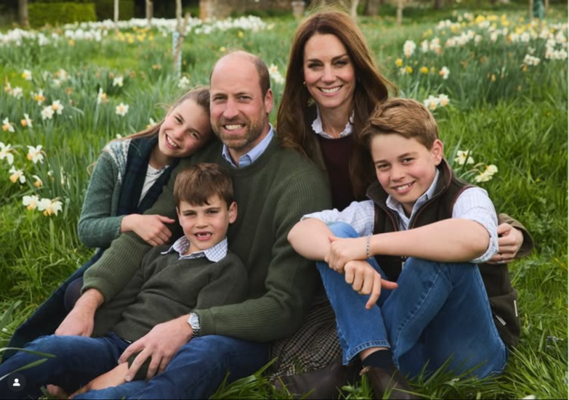 Кадърът показва петчленното семейство, сгушено сред поле с нарциси, облечено в хармонични земни тонове – зелено и кафяво. Шарлот и Луи са прегърнали принц Уилям, а Кейт е сложила ръка около раменете на Джордж.