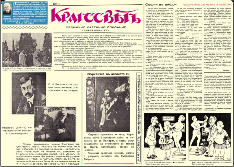 Представяме ви сп. “Крагосвeтъ”, бр. 1 на седмичното картинно списание от 1929 г. То веднага се налага като високо естетично списание още от първия си брой. Откриване паметник и барелеф на гроба на Яворов. Снимка на слепия поет с Тодор Александров. Особено любопитна е статистиката на София по население, семейства и националност. Книжни куриози. Две симетрични остроумни карикатури.