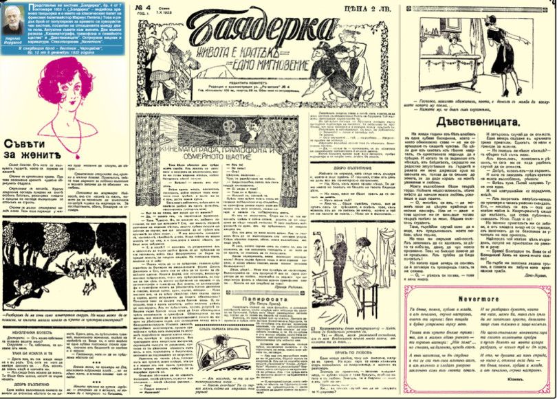 Представяме ви вестник “Баядерка”, бр. 4 от 7 октомври 1923 г. (“Баядерка” – индийска храмова танцьорка и е името на класическия балет на френския балетмайстор Мариус Петипа.) Това е рядък брой от популярния за времето си хумористичен вестник, посветен на отношенията между двата пола. Актуални съвети към жените. Два мъжки разказа “Кинематографа, грамофона и семейното щастие” и “Девственицата”. Остроумни вицове и карикатури. Стихотворение “Nevermore”.