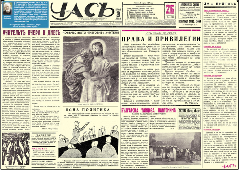 Представяме ви вестник “Часъ” бр. 26 от 3 март 1937 г. Това е отдавна забравен вестник, който е просъществувал съвсем кратко време, останал без средства, въпреки настоятелните призиви за помощ. Статия за съдбата на учителите от Ст. Омарчевски. “Права и привилегии” – размисли за кандидат студентите. “Змей и Яна” – премиера на танцовата пантомима в Народния театър. Рубрика “За и против”. Карикатура за намесата в испанската гражданска война. “Целувката на Юда”.