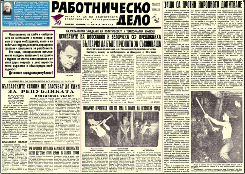 Представяме ви вестник “Работническо дело”, бр. 193 от 27 август 1946 година. България пред избор за нова конституция, в която да е обявена за република. Подкрепа от цялата страна. Белорусия и Югославия предлагат България да бъде призната за съвоюваща страна във войната срещу Германия. Призив за помощ на испанския народ в бедствие. Селяните масово гласуват за република.
