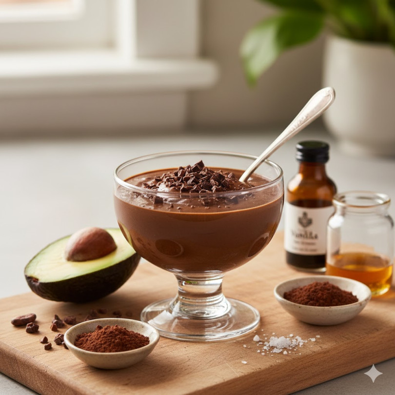Начин на приготвяне: Авокадото се обелва и нарязва на парчета. Всички съставки се поставят в блендер и се пасират дълго, докато се получи напълно гладък, лъскав крем. Солта подсилва шоколадовия вкус и не бива да се пропуска. Мусът се охлажда поне 30 минути в хладилник, за да стегне и да развие ароматите си. Поднася се в малки чаши, поръсен с фино настърган черен шоколад или няколко какаови зърна.