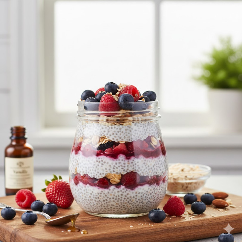 Начин на приготвяне: Киселото мляко се смесва с чиата, подсладителя и ванилията. Разбърква се добре и се оставя в хладилник за минимум 4 часа, най-добре за една нощ. Плодовете се намачкват леко с вилица или се затоплят за кратко на котлон, за да пуснат сок. В чаша или буркан се редят слоеве – чиа крем, плодове, ядки, отново крем. Преди сервиране се охлажда допълнително.