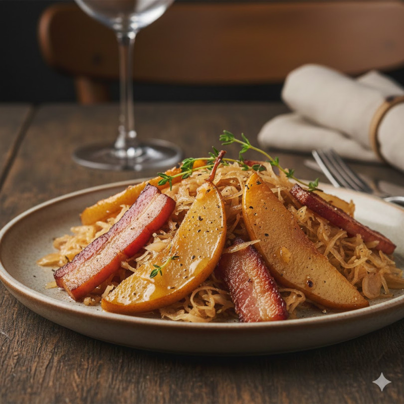 Начин на приготвяне: Киселото зеле се измива леко, ако е твърде солено, и се нарязва на по-ситно. В дълбок тиган беконът се запича до златисто и се изважда. В същата мазнина се добавя маслото и нарязаната на резени круша, която се поръсва със захарта и се оставя да се карамелизира за няколко минути. Прибавя се зелето и се задушава на умерен огън около 10 минути. Налива се бялото вино и се оставя да изври. Накрая се връща беконът, подправя се с черен пипер и по желание с малко мащерка. Ястието се поднася топло като самостоятелно предястие или гарнитура към печено месо.