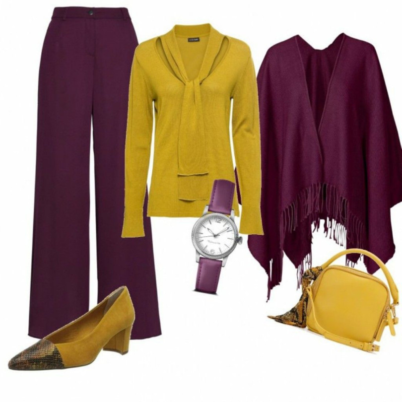 Лилавото в нюанс на теменужено или наситен аметист е сред водещите цветове на сезона. В комбинация с горчица се получава контраст, който стои изненадващо елегантно. Практичен пример: вталено лилаво сако с прав, леко разширен панталон в цвят горчица и неутрална блуза в екрю. Добавете кожена чанта в кафяво и обувки на стабилен ток – визията е модерна, но балансирана. За по-смелите дами – рокля в горчичен тон с лилав колан и обувки в същата гама.