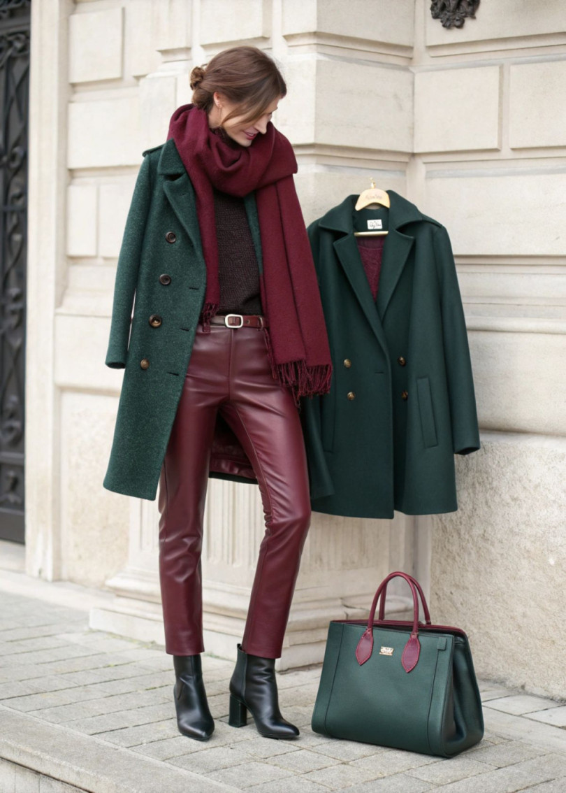 Виненият цвят също излиза на преден план, особено в комбинация със свежо или маслиненозелено. Това е отличен избор за ежедневен офис стил. Винена риза от сатениран памук, комбинирана със зелена миди пола с лека А-линия, създава усещане за увереност и индивидуалност. За по-официален повод – винен костюм с подчертана талия и зелени аксесоари, например обувки или структурирана чанта.