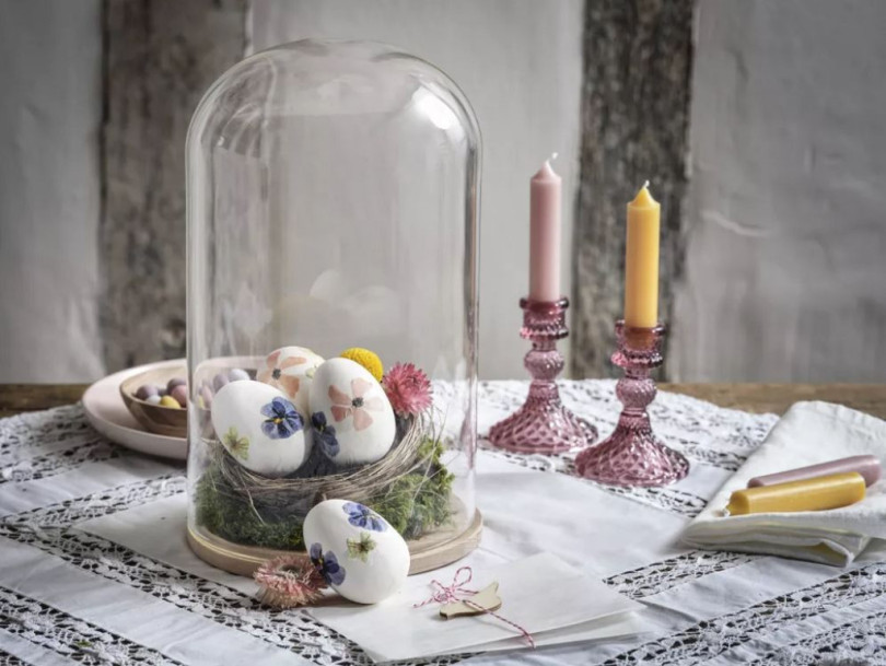 Вместо стандартното подреждане в кошница боядисаните яйца могат да се превърнат в централен декоративен акцент чрез поставяне под стъклен купол или похлупак за торта. Подходящи са и специални декоративни съдове. В основата може да се добави изкуствена трева, мъх или ръчно оформено гнездо от тънки клонки. Така яйцата се представят като експонати и произведения на изкуството, а композицията е подходяща за център на празничната маса.