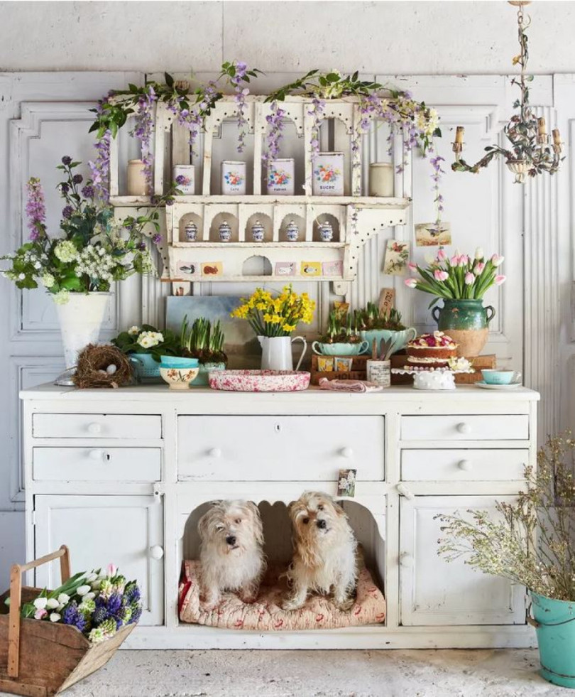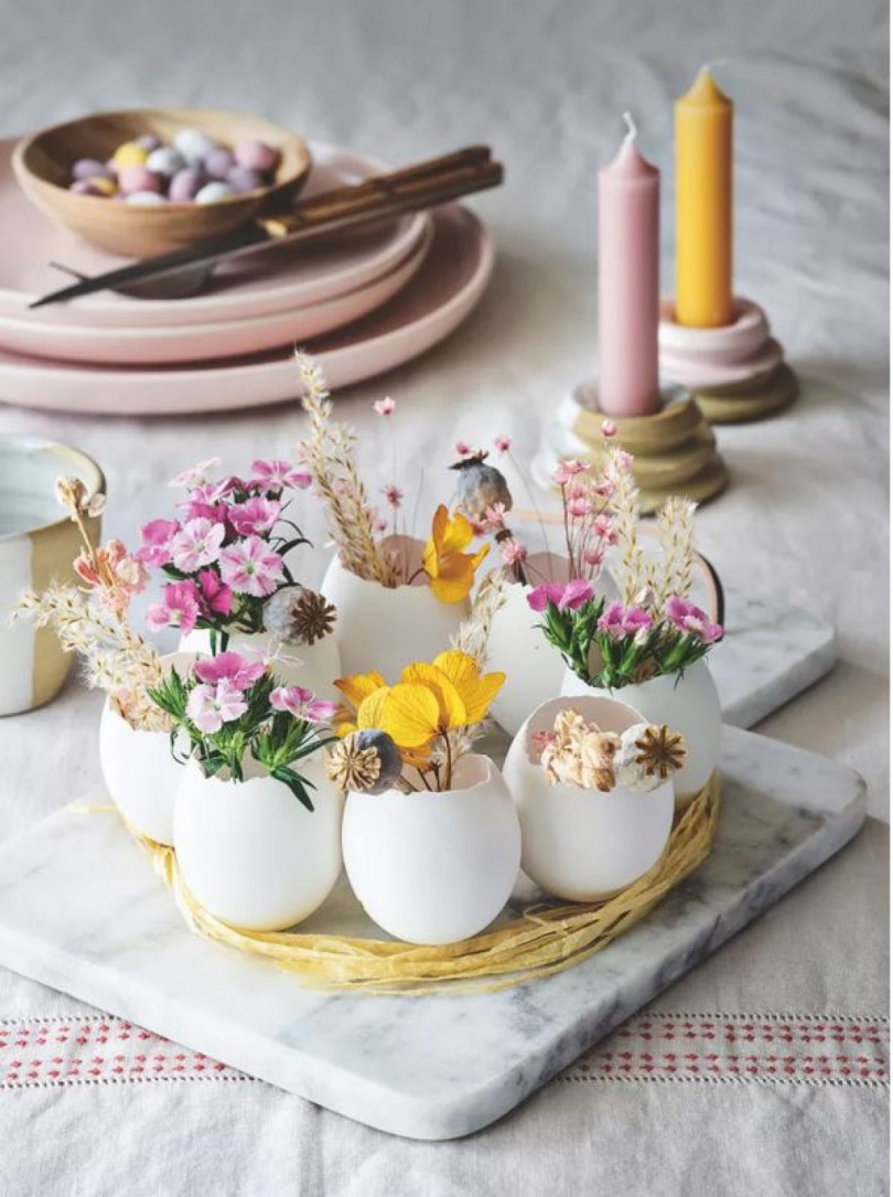 Яйчените черупки могат да бъдат използвани повторно като миниатюрни съдове за цветя. След внимателно почистване те се подреждат в поднос или декоративна чиния. Във всяка черупка се поставя малко вода или парче влажна гъба, което позволява да се аранжират свежи пролетни цветя. Подходящи са дребни растения като теменужки или клонки от цъфтящи дървета.