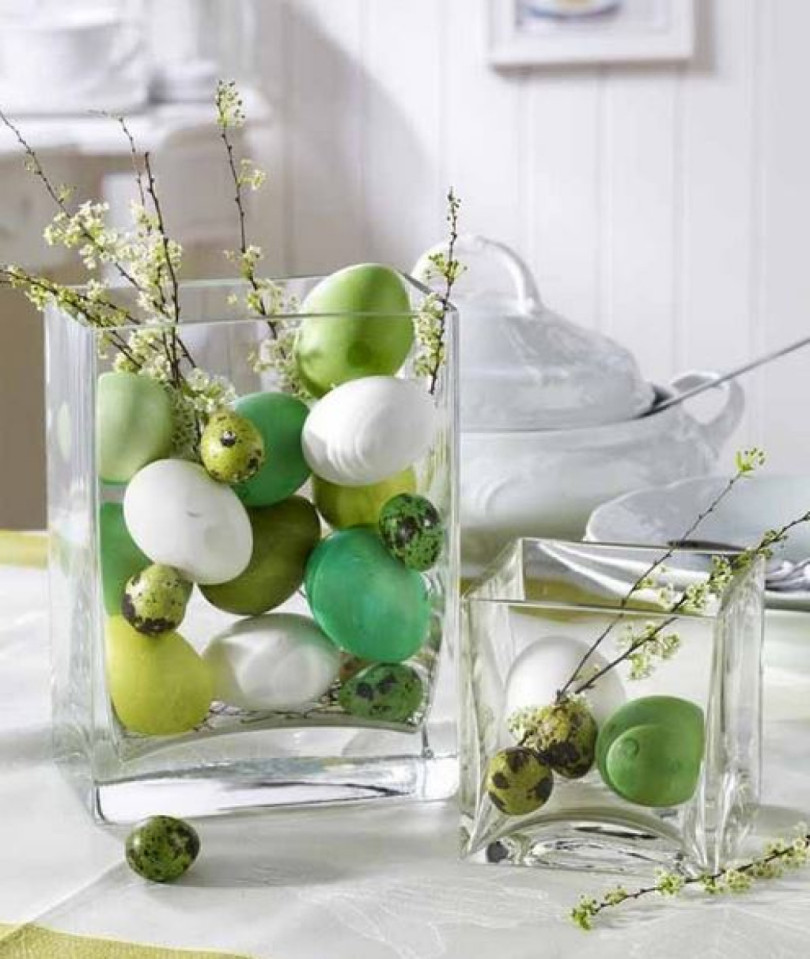 Големи прозрачни вази могат да се използват като съдове за боядисани яйца. Те се подреждат вътре по цвят или на случаен принцип. Към композицията могат да се добавят декоративни елементи като фигурки, панделки или изкуствени цветя. Подходящо решение за холна или трапезна маса.