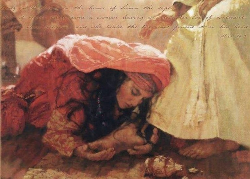 Тя успяла да влезе в дома, където бил Той, за да засвидетелства почитта си, а в бързината счупила съда, за да разлее по-лесно мирото.